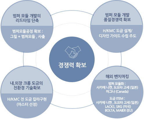 대륙금속은 2006년 국내 업계 중 유일하게 제품설계, 개발, 생산, 인도에 이르는 생산전반의 풀 라인 서비스 시스템(FULL-LINE SERVICE SYSTEMS)을 구축하여 주목을 받았습니다. 이는 라디에이터 그릴과 자동차 범퍼를 한 세트로 조립해 납품하는 모듈화 공정입니다. 또한 품질 관리 및 기술개발을 위한 연구실을 운영하여 고객만족에 있어 철저한 서비스를 제공하기 위한 노력을 하고 있습니다.