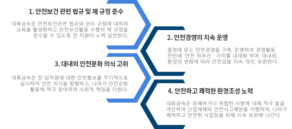 - 안전하고 쾌적한 작업환경 조성을 위해 모든 임직원이 동참하는 안전문화를 조성한다.